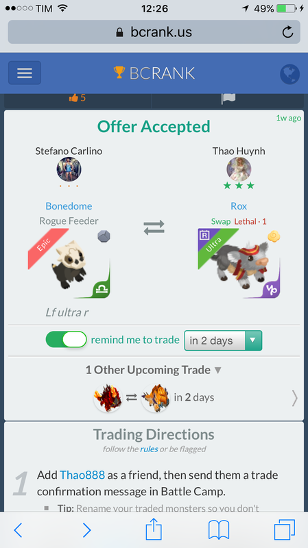 Hi. Offer me 2 Rogue ultra Continue with Facebook clear OR attach pictures Battle Camp Monster Trading Marketplace Trade Details ★★★ Nicolas Copin 7y ago Niicolas L70 .... 102 9y ago Offer Accepted Nicolas Copin ★ ★ ★ Rox Swap Lethal · 1 Alexa Florina ★ ★ ★ Anacactus Rogue Feeder Hi. Offer me 2 Rogue ultra 5 comments ★ · · Stefano Carlino Rox capricorn declined · 9y ago · translate ★★★ Alexa Florina can I offer ultra rogue u grab?? 9y ago · translate ★★★ Nicolas Copin Yes . 2 ultra rogue :) 9y ago · translate ★★★ Alexa Florina Firemane Blast Rogue · 1 9y ago ★★★ Alexa Florina Anacactus Rogue Feeder offer accepted · 9y ago You must login to offer a trade. Related #battlecamp, #mobile, #mmo, #pvp PvP - Grapes1982 vs Echua8 Another awesome pair of leaf teams titans throw down, Grapes1982 and Echua8. Check out their intense side by side match. #battlecamp, #pvp, #team, #mobile, #mmo PvP - DShep420 vs Chanco21 - 2nd match Part Two of Dshep420 and Chanco21’s Rainbow Specials PvP. Observe how the balance of healing and hitting can make or break a heated battle. #battlecamp, #mobile, #mmo, #pvp Carlos Grapes vs mic1989 Watch PvP Warlord Carlos Grapes against a team of legendaries... what do you think will happen? ;) Check out Carlos's PvP Profile on Battle Camp Bible #battlecamp, #pvp, #team, #mobile, #mmo PvP - Dshep420 vs Chanco21 Two seasoned Rainbow PvPers slug it out in one of the preliminary rounds of the Rainbow Specials Tournament. Watch how each player make massive combos to knock each other out. #battlecamp, #pvp, #team, #mobile, #mmo PvP - Grapes vs. dev mythic team When all epic and legendary teams die in 10 sec, an ultra team showed some fight... #battlecamp, #pvp, #team, #mobile, #mmo PvP - Broyalty vs. MiaJane Watch Broyalty's wind team vs. MiaJane's rock team. Broyalty has a 1530 PvP rating with a 4:1 win to loss ratio! scroll to top