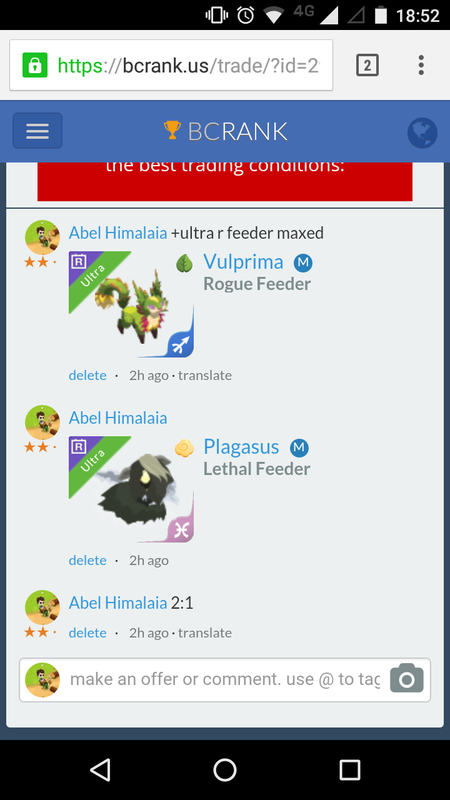 Ecto Taurus please... Continue with Facebook clear OR attach pictures Battle Camp Monster Trading Marketplace Trade Details ★★★ Valerio C. 6y ago SerCrocodile L70 Crudu SdM 65 9y ago Offer Accepted Valerio C. ★ ★ ★ Vulprima Snipe+ Rogue · 1 Nathan Lefebvre ★ ★ · Ectoprowl Snipe+ Rogue · 1 M Ecto Taurus please... Can you max ? 15 comments ★★★ Mauricio Martinez Clubthumper Group Heal+ Mender · 1 declined · 9y ago ★★★ Berchier Elian declined · 9y ago ★★★ Apisit Sae-Ngow Vulprima Toxic+ Rogue · 1 declined · 9y ago ★★★ Abel Himalaia 2:1 maxed declined · 9y ago · translate · · · Фома Игорев Chirpera Swap Lethal · 1 M declined · 9y ago ★★★ Sebastien Seb i can max and add spe x5 max Vulprima Waterblight+ Rogue · 1 declined · 9y ago · translate ★★ · Luiz Pereira Pick 1 buddy.. i need pisces snipe :) declined · 9y ago · translate ★★★ Johnny M. Romouse Swap+ Lethal · 2 declined · 9y ago ★★★ Johnny M. Vulprima Lacerate+ Rogue · 1 M declined · 9y ago ★★★ Constance A. max for max Vulprima Toxic+ Rogue · 1 M declined · 9y ago · translate ★★★ Илья Капица Demigeode Swap Lethal · 1 declined · 9y ago ★★★ Hernani M. 2 to 1 Chirpera Swap Lethal · 1 declined · 9y ago · translate ★★★ Hernani M. Rox Swap Lethal · 1 declined · 9y ago ★★★ Nick Lars [Unaccepted by Rio12 on 09-10-2016] Ectoprowl Snipe+ Rogue · 1 M declined · 9y ago · translate ★★ · Nathan Lefebvre Can you max ? Ectoprowl Snipe+ Rogue · 1 M offer accepted · 9y ago · translate You must login to offer a trade. Related #battlecamp, #mobile, #mmo, #pvp PvP - Grapes1982 vs Echua8 Another awesome pair of leaf teams titans throw down, Grapes1982 and Echua8. Check out their intense side by side match. #battlecamp, #pvp, #team, #mobile, #mmo PvP - DShep420 vs Chanco21 - 2nd match Part Two of Dshep420 and Chanco21’s Rainbow Specials PvP. Observe how the balance of healing and hitting can make or break a heated battle. #battlecamp, #mobile, #mmo, #pvp Carlos Grapes vs mic1989 Watch PvP Warlord Carlos Grapes against a team of legendaries... what do you think will happen? ;) Check out Carlos's PvP Profile on Battle Camp Bible #battlecamp, #pvp, #team, #mobile, #mmo PvP - Dshep420 vs Chanco21 Two seasoned Rainbow PvPers slug it out in one of the preliminary rounds of the Rainbow Specials Tournament. Watch how each player make massive combos to knock each other out. #battlecamp, #pvp, #team, #mobile, #mmo PvP - Grapes vs. dev mythic team When all epic and legendary teams die in 10 sec, an ultra team showed some fight... #battlecamp, #pvp, #team, #mobile, #mmo PvP - Broyalty vs. MiaJane Watch Broyalty's wind team vs. MiaJane's rock team. Broyalty has a 1530 PvP rating with a 4:1 win to loss ratio! scroll to top