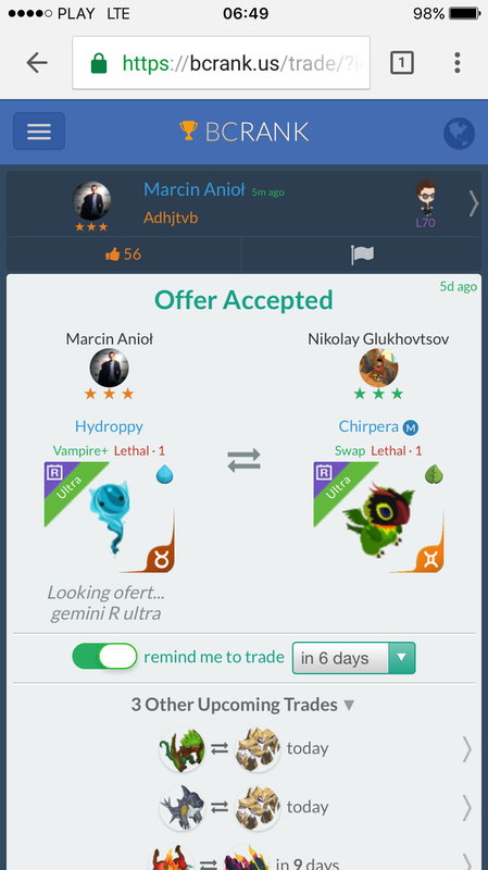 LF two any R ultra rogue feeder. Continue with Facebook clear OR attach pictures Battle Camp Monster Trading Marketplace Trade Details ★★★ JC García 7y ago jucega L70 coda 94 9y ago Offer Accepted JC García ★ ★ ★ Romouse Swap+ Lethal · 1 James Deere ★ ★ ★ Vulprima Quick Strike+ Rogue · 1 M LF two any R ultra rogue feeder. 7 comments ★★★ James Deere Vulprima Quick Strike+ Rogue · 1 M declined · 9y ago ★★★ James Deere 2:1 declined · 9y ago · translate ★★★ JC García sorry, offer again 9y ago · translate ★★★ JC García pls 9y ago · translate ★★★ James Deere Vulprima Quick Strike+ Rogue · 1 M offer accepted · 9y ago ★★★ James Deere 2:1 9y ago · translate ★★★ JC García 2:1 accept 9y ago · translate You must login to offer a trade. Related #battlecamp, #mobile, #mmo, #pvp PvP - Grapes1982 vs Echua8 Another awesome pair of leaf teams titans throw down, Grapes1982 and Echua8. Check out their intense side by side match. #battlecamp, #pvp, #team, #mobile, #mmo PvP - DShep420 vs Chanco21 - 2nd match Part Two of Dshep420 and Chanco21’s Rainbow Specials PvP. Observe how the balance of healing and hitting can make or break a heated battle. #battlecamp, #mobile, #mmo, #pvp Carlos Grapes vs mic1989 Watch PvP Warlord Carlos Grapes against a team of legendaries... what do you think will happen? ;) Check out Carlos's PvP Profile on Battle Camp Bible #battlecamp, #pvp, #team, #mobile, #mmo PvP - Dshep420 vs Chanco21 Two seasoned Rainbow PvPers slug it out in one of the preliminary rounds of the Rainbow Specials Tournament. Watch how each player make massive combos to knock each other out. #battlecamp, #pvp, #team, #mobile, #mmo PvP - Grapes vs. dev mythic team When all epic and legendary teams die in 10 sec, an ultra team showed some fight... #battlecamp, #pvp, #team, #mobile, #mmo PvP - Broyalty vs. MiaJane Watch Broyalty's wind team vs. MiaJane's rock team. Broyalty has a 1530 PvP rating with a 4:1 win to loss ratio! scroll to top