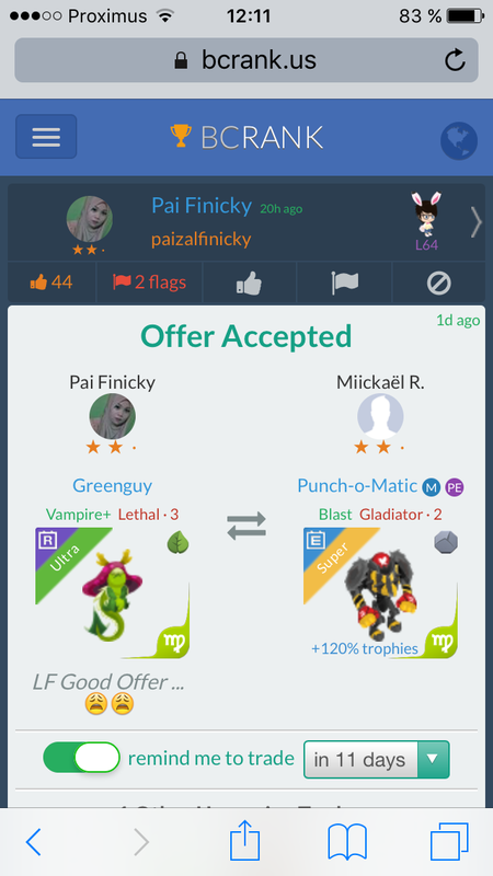 lf gemini grind-o-matic :) Continue with Facebook clear OR attach pictures Battle Camp Monster Trading Marketplace Trade Details ★★ · Mark B. 5y ago mark1367885 L70 Gut drauf :) 39 8y ago Offer Accepted Mark B. ★ ★ · Treeture Snipe Rogue · 7 +500% attack M Yannick Lanthier ★ ★ ★ Treegon Snipe Lethal · 1 +1100% attack MPE lf gemini grind-o-matic :) Maybe this? 7 comments ★★★ Wattikorn Sae-Siw 3 R rogue or lethal tier1 super u can choose from my inventory 9y ago · translate ★★ · Mark B. No sorry 9y ago · translate ★★★ Miickaël R. Ultra r for you declined · 9y ago · translate ★ · · Emmanuelle B. +500% attack Treeture Snipe Lethal · 1 M declined · 9y ago ★★★ Yannick Lanthier Shellterpelter Waterbane+ Rogue · 7 MPE declined · 8y ago ★★ · Mark B. Nice offer, but not what I am looking ;) 8y ago · translate ★★★ Yannick Lanthier Maybe this? +1100% attack Treegon Snipe Lethal · 1 MPE offer accepted · 8y ago · translate You must login to offer a trade. Related #battlecamp, #mobile, #mmo, #pvp PvP - Grapes1982 vs Echua8 Another awesome pair of leaf teams titans throw down, Grapes1982 and Echua8. Check out their intense side by side match. #battlecamp, #pvp, #team, #mobile, #mmo PvP - DShep420 vs Chanco21 - 2nd match Part Two of Dshep420 and Chanco21’s Rainbow Specials PvP. Observe how the balance of healing and hitting can make or break a heated battle. #battlecamp, #mobile, #mmo, #pvp Carlos Grapes vs mic1989 Watch PvP Warlord Carlos Grapes against a team of legendaries... what do you think will happen? ;) Check out Carlos's PvP Profile on Battle Camp Bible #battlecamp, #pvp, #team, #mobile, #mmo PvP - Dshep420 vs Chanco21 Two seasoned Rainbow PvPers slug it out in one of the preliminary rounds of the Rainbow Specials Tournament. Watch how each player make massive combos to knock each other out. #battlecamp, #pvp, #team, #mobile, #mmo PvP - Grapes vs. dev mythic team When all epic and legendary teams die in 10 sec, an ultra team showed some fight... #battlecamp, #pvp, #team, #mobile, #mmo PvP - Broyalty vs. MiaJane Watch Broyalty's wind team vs. MiaJane's rock team. Broyalty has a 1530 PvP rating with a 4:1 win to loss ratio! scroll to top