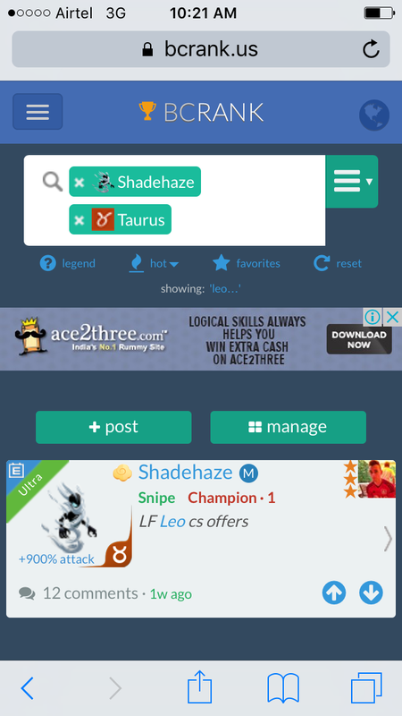 jawzor, shadehaze or erodonite taurus t1 or t2 Continue with Facebook clear OR attach pictures Battle Camp Monster Trading Marketplace Trade Details ★★★ Juan Jose Alcala Ram 4y ago iberica L66 taurus 146 8y ago Offer Accepted Juan Jose Alcala Ramirez ★ ★ ★ Jawzor Snipe Gladiator · 1 +900% attack M Naren Bhati ★ ★ ★ Shadehaze Snipe Champion · 1 +900% attack M jawzor, shadehaze or erodonite taurus t1 or t2 12 comments ★★★ Mishyla Tharasovel +900% attack Erodonite Snipe Protector · 1 M declined · 9y ago ★★★ Mario Nishikawa Swap please? I can add treasaur firebane? +900% attack Jawzor Snipe Gladiator · 1 M declined · 9y ago · translate ★★★ Juan Jose Alcala Ramirez I am sorry I cant wait 12 days. I need taurus. Thanks for your offer. Good look. 9y ago · translate ★★★ Adnan T. +900% attack Jawzor Snipe Bruiser · 1 M 9y ago ★★★ Naren Bhati [Unaccepted by iberica on 12-15-2016] declined · 8y ago · translate ★ · · Kappiekt Wind +900% attack Erodonite Snipe Champion · 1 M 8y ago ★★★ Christian Tjhie Can add something else if you're interested. +900% attack Jawzor Snipe Protector · 1 M 8y ago · translate ★★★ Juan Jose Alcala Ramirez what you can add? 8y ago · translate ★★★ Christian Tjhie Rogue ultra feeder / multiple R supers? 8y ago · translate ★★★ Naren Bhati +900% attack Shadehaze Snipe Champion · 1 M offer accepted · 8y ago ★★★ Juan Jose Alcala Ramirez christian what ultra r feeder your offer? I want see photo please 8y ago · translate ★★★ Naren Bhati I can Do PE for PE 8y ago · translate You must login to offer a trade. Related #battlecamp, #mobile, #mmo, #pvp PvP - Grapes1982 vs Echua8 Another awesome pair of leaf teams titans throw down, Grapes1982 and Echua8. Check out their intense side by side match. #battlecamp, #pvp, #team, #mobile, #mmo PvP - DShep420 vs Chanco21 - 2nd match Part Two of Dshep420 and Chanco21’s Rainbow Specials PvP. Observe how the balance of healing and hitting can make or break a heated battle. #battlecamp, #mobile, #mmo, #pvp Carlos Grapes vs mic1989 Watch PvP Warlord Carlos Grapes against a team of legendaries... what do you think will happen? ;) Check out Carlos's PvP Profile on Battle Camp Bible #battlecamp, #pvp, #team, #mobile, #mmo PvP - Dshep420 vs Chanco21 Two seasoned Rainbow PvPers slug it out in one of the preliminary rounds of the Rainbow Specials Tournament. Watch how each player make massive combos to knock each other out. #battlecamp, #pvp, #team, #mobile, #mmo PvP - Grapes vs. dev mythic team When all epic and legendary teams die in 10 sec, an ultra team showed some fight... #battlecamp, #pvp, #team, #mobile, #mmo PvP - Broyalty vs. MiaJane Watch Broyalty's wind team vs. MiaJane's rock team. Broyalty has a 1530 PvP rating with a 4:1 win to loss ratio! scroll to top