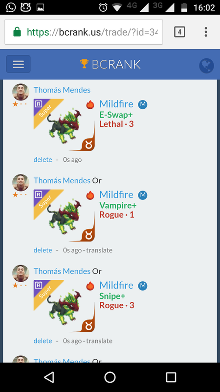 Same in scorpio. Continue with Facebook clear OR attach pictures Battle Camp Monster Trading Marketplace Trade Details ★★★ Klemen G. 4y ago Grmekk L70 Offer me scorpio :) 218 8y ago Offer Accepted Klemen G. ★ ★ ★ Treasaur Firebane+ Rogue · 1 M Nathaniel Rouse ★ ★ ★ Treasaur Firebane+ Rogue · 1 M Same in scorpio. 7 comments ★★★ Jesus De Atocha Soprapera Snipe+ Rogue · 1 declined · 9y ago ★★★ Jesus De Atocha or Mildfire Lacerate+ Rogue · 1 declined · 9y ago · translate ★★★ Thomás Mendes declined · 8y ago ★★★ Thomás Mendes Or Shellter Crush+ Rogue · 1 M declined · 8y ago · translate ★★★ Ersoy Şükran V. declined · 8y ago ★★ · Douglas Kin Chagas Dos Santos Cyborworm E-Swap+ Lethal · 1 declined · 8y ago ★★★ Nathaniel Rouse Treasaur Firebane+ Rogue · 1 M offer accepted · 8y ago You must login to offer a trade. Related #battlecamp, #mobile, #mmo, #pvp PvP - Grapes1982 vs Echua8 Another awesome pair of leaf teams titans throw down, Grapes1982 and Echua8. Check out their intense side by side match. #battlecamp, #pvp, #team, #mobile, #mmo PvP - DShep420 vs Chanco21 - 2nd match Part Two of Dshep420 and Chanco21’s Rainbow Specials PvP. Observe how the balance of healing and hitting can make or break a heated battle. #battlecamp, #mobile, #mmo, #pvp Carlos Grapes vs mic1989 Watch PvP Warlord Carlos Grapes against a team of legendaries... what do you think will happen? ;) Check out Carlos's PvP Profile on Battle Camp Bible #battlecamp, #pvp, #team, #mobile, #mmo PvP - Dshep420 vs Chanco21 Two seasoned Rainbow PvPers slug it out in one of the preliminary rounds of the Rainbow Specials Tournament. Watch how each player make massive combos to knock each other out. #battlecamp, #pvp, #team, #mobile, #mmo PvP - Grapes vs. dev mythic team When all epic and legendary teams die in 10 sec, an ultra team showed some fight... #battlecamp, #pvp, #team, #mobile, #mmo PvP - Broyalty vs. MiaJane Watch Broyalty's wind team vs. MiaJane's rock team. Broyalty has a 1530 PvP rating with a 4:1 win to loss ratio! scroll to top
