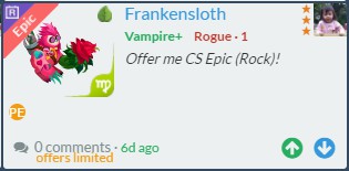 LF CS Epic (Leaf) only!! Continue with Facebook clear OR attach pictures Battle Camp Monster Trading Marketplace Trade Details ★★★ Galasei Lun 6y ago Galasei L70 Call me Freddie ~~~ 239 8y ago Offer Accepted Galasei Lun ★ ★ ★ Amephyst Crush+ Cavalry · 1 PE Ruslan Korchevskiy ★ ★ ★ Trilowrot Snipe Bruiser · 1 +2700% attack MPE LF CS Epic (Leaf) only!! if you add franken pe 6 comments ★★★ Alec Buisson I've those 2 incoming, for your 2 amephyst if you want Pm me :) declined · 8y ago · translate ★★★ Ruslan Korchevskiy if you add franken pe +2700% attack Trilowrot Snipe Bruiser · 1 MPE offer accepted · 8y ago · translate ★★★ Galasei Lun Hi, Do you mean my Amephyst add this Frankensloth to trade your Trilowrot? If yes, I accept... 8y ago · translate ★★★ Ruslan Korchevskiy yes 8y ago · translate ★★★ Alec Buisson So you will give 2 Pe for 1 trilo but you declined my offer to give 2 Pe for 1 Pe trilo + 1 unevo ? 😂😂 8y ago · translate ★★★ Galasei Lun Alec, because the passive is also important to me ... I prefer T2.. 8y ago · translate You must login to offer a trade. Related #battlecamp, #mobile, #mmo, #pvp PvP - Grapes1982 vs Echua8 Another awesome pair of leaf teams titans throw down, Grapes1982 and Echua8. Check out their intense side by side match. #battlecamp, #pvp, #team, #mobile, #mmo PvP - DShep420 vs Chanco21 - 2nd match Part Two of Dshep420 and Chanco21’s Rainbow Specials PvP. Observe how the balance of healing and hitting can make or break a heated battle. #battlecamp, #mobile, #mmo, #pvp Carlos Grapes vs mic1989 Watch PvP Warlord Carlos Grapes against a team of legendaries... what do you think will happen? ;) Check out Carlos's PvP Profile on Battle Camp Bible #battlecamp, #pvp, #team, #mobile, #mmo PvP - Dshep420 vs Chanco21 Two seasoned Rainbow PvPers slug it out in one of the preliminary rounds of the Rainbow Specials Tournament. Watch how each player make massive combos to knock each other out. #battlecamp, #pvp, #team, #mobile, #mmo PvP - Grapes vs. dev mythic team When all epic and legendary teams die in 10 sec, an ultra team showed some fight... #battlecamp, #pvp, #team, #mobile, #mmo PvP - Broyalty vs. MiaJane Watch Broyalty's wind team vs. MiaJane's rock team. Broyalty has a 1530 PvP rating with a 4:1 win to loss ratio! scroll to top