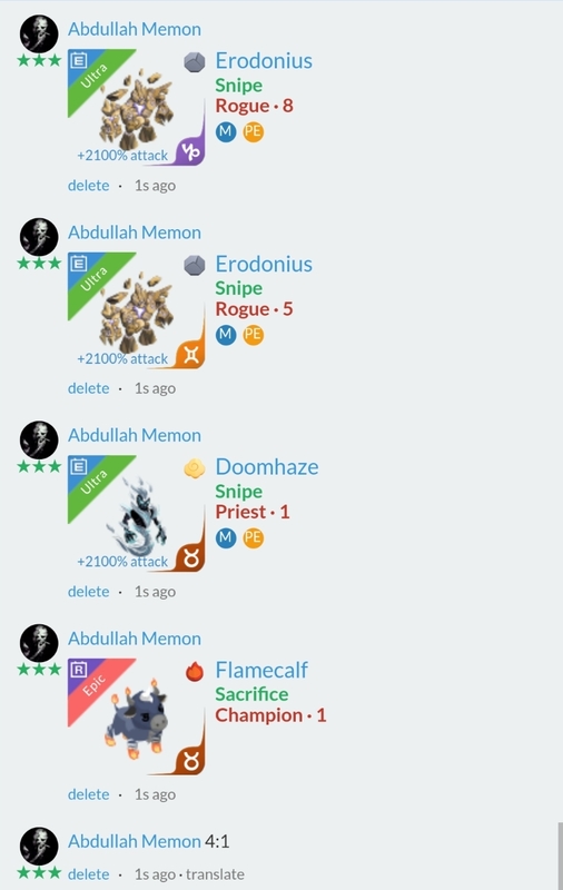 Same sagittarius Continue with Facebook clear OR attach pictures Battle Camp Monster Trading Marketplace Trade Details ★★ · Majed Alshelaqi 8y ago BmmB2662 L70 39 8y ago Offer Accepted Majed Alshelaqi ★ ★ · Trilowrot Snipe Champion · 1 +2700% attack MPE Haldun Akkaş ★ ★ ★ Trilowrot Snipe Shaman · 1 +2700% attack MPE Same sagittarius 3 comments ★★★ Abdullah Memon declined · 8y ago ★★★ João Arruda do you still have a monolimpius ? 8y ago · translate ★★★ Haldun Akkaş +2700% attack Trilowrot Snipe Shaman · 1 MPE offer accepted · 8y ago You must login to offer a trade. Related #battlecamp, #mobile, #mmo, #pvp PvP - Grapes1982 vs Echua8 Another awesome pair of leaf teams titans throw down, Grapes1982 and Echua8. Check out their intense side by side match. #battlecamp, #pvp, #team, #mobile, #mmo PvP - DShep420 vs Chanco21 - 2nd match Part Two of Dshep420 and Chanco21’s Rainbow Specials PvP. Observe how the balance of healing and hitting can make or break a heated battle. #battlecamp, #mobile, #mmo, #pvp Carlos Grapes vs mic1989 Watch PvP Warlord Carlos Grapes against a team of legendaries... what do you think will happen? ;) Check out Carlos's PvP Profile on Battle Camp Bible #battlecamp, #pvp, #team, #mobile, #mmo PvP - Dshep420 vs Chanco21 Two seasoned Rainbow PvPers slug it out in one of the preliminary rounds of the Rainbow Specials Tournament. Watch how each player make massive combos to knock each other out. #battlecamp, #pvp, #team, #mobile, #mmo PvP - Grapes vs. dev mythic team When all epic and legendary teams die in 10 sec, an ultra team showed some fight... #battlecamp, #pvp, #team, #mobile, #mmo PvP - Broyalty vs. MiaJane Watch Broyalty's wind team vs. MiaJane's rock team. Broyalty has a 1530 PvP rating with a 4:1 win to loss ratio! scroll to top