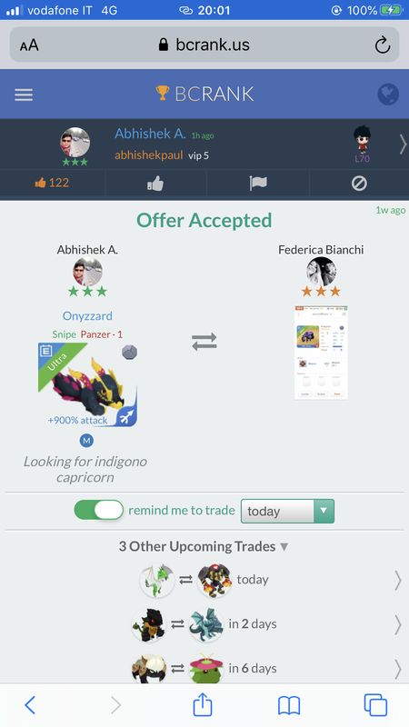 Same in sagittarius Continue with Facebook clear OR attach pictures Battle Camp Monster Trading Marketplace Trade Details ★★★ 野 田 3y ago MaxTian L70 Aha 207 5y ago Offer Accepted 野 田 ★ ★ ★ Onyzzaurd Snipe Bulwark · 2 +2100% attack MPE Federica Bianchi ★ ★ ★ Onyzzaurd Snipe Panzer · 1 +2100% attack MPE Same in sagittarius 8 comments ★★★ Sara B. +2100% attack Flysaur Snipe Bruiser · 3 MPE declined · 5y ago ★★★ O`Santos M. How many rboost you look for team dominio uktra rock? 5y ago · translate ★★ · Allan Flores +2100% attack Onyzzaurd Snipe Priest · 2 MPE declined · 5y ago ★★ · Allan Flores Agrego 1 ultra R feed 5y ago · translate ★★★ Federica Bianchi tomorrow becomes mine, I can evolve it perfect 5y ago · translate ★★★ 野 田 post monster please 5y ago · translate ★★★ 野 田 pe and max please 5y ago · translate ★★★ Federica Bianchi +2100% attack Onyzzaurd Snipe Panzer · 1 MPE offer accepted · 5y ago You must login to offer a trade. Related #battlecamp, #mobile, #mmo, #pvp PvP - Grapes1982 vs Echua8 Another awesome pair of leaf teams titans throw down, Grapes1982 and Echua8. Check out their intense side by side match. #battlecamp, #pvp, #team, #mobile, #mmo PvP - DShep420 vs Chanco21 - 2nd match Part Two of Dshep420 and Chanco21’s Rainbow Specials PvP. Observe how the balance of healing and hitting can make or break a heated battle. #battlecamp, #mobile, #mmo, #pvp Carlos Grapes vs mic1989 Watch PvP Warlord Carlos Grapes against a team of legendaries... what do you think will happen? ;) Check out Carlos's PvP Profile on Battle Camp Bible #battlecamp, #pvp, #team, #mobile, #mmo PvP - Dshep420 vs Chanco21 Two seasoned Rainbow PvPers slug it out in one of the preliminary rounds of the Rainbow Specials Tournament. Watch how each player make massive combos to knock each other out. #battlecamp, #pvp, #team, #mobile, #mmo PvP - Grapes vs. dev mythic team When all epic and legendary teams die in 10 sec, an ultra team showed some fight... #battlecamp, #pvp, #team, #mobile, #mmo PvP - Broyalty vs. MiaJane Watch Broyalty's wind team vs. MiaJane's rock team. Broyalty has a 1530 PvP rating with a 4:1 win to loss ratio! scroll to top