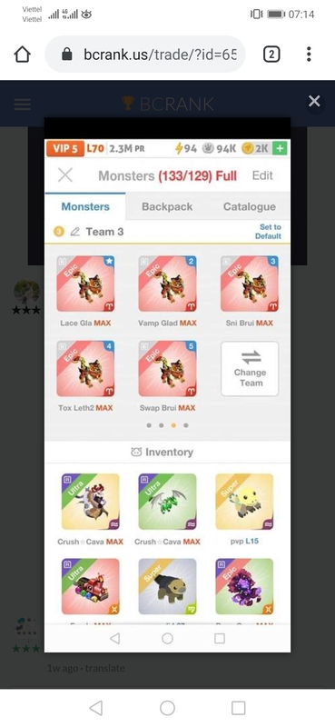 Looking for good oferts preferer gemini Continue with Facebook clear OR attach pictures Battle Camp Monster Trading Marketplace Trade Details ★★ · Beto Oliveira 1y ago bobiliverfaust L70 Gemeos 43 5y ago Offer Accepted Beto Oliveira ★ ★ · Siegedragon Blast Shaman · 1 +300% trophies MPE Joelson Jhoey ★ ★ ★ Jawzilla Snipe Gladiator · 1 +2100% attack MPE Looking for good oferts preferer gemini 5X1 23 comments ★★★ Ayman Aljahdali Skelesaur Toxic Rogue · 2 MPE declined · 5y ago ★★★ Ayman Aljahdali Skelesaur Snipe Cleric · 1 MPE declined · 5y ago ★★★ Ayman Aljahdali FancyAristocat Lacerate Rogue · 3 MPE declined · 5y ago ★★★ Ayman Aljahdali Springdragon Snipe+ Cavalry+ · 1 MPEEQ declined · 5y ago ★★★ Ayman Aljahdali 5:1 Springdragon Firebane+ Cavalry+ · 1 MPEEQ declined · 5y ago · translate ★★★ Chong In merge 2338 +2700% attack Chillsickle Snipe Champion · 9 MPE declined · 5y ago · translate ★★★ Chong In Igneohorn Toxic+ Lethal+ · 1 EQ declined · 5y ago ★★★ Chong In 3x1 Igneohorn Toxic+ Lethal+ · 1 EQ declined · 5y ago · translate ★★★ Derikll G. 6x1 declined · 5y ago · translate ★★★ Derikll G. declined · 5y ago ★★★ Derikll G. 12x1 declined · 5y ago · translate ★★★ Derikll G. declined · 5y ago ★★★ Quân Nguyễn 5.1 declined · 5y ago · translate ★★★ Damien M. Merged 2507 declined · 5y ago · translate ★★★ Damien M. Full rboost 2-1 Cottonmob Sacrifice Knight · 7 M999999 declined · 5y ago · translate ★★★ Edwin Rodriguez Merge 2315 +2700% attack Chillsickle Snipe Cavalry · 9 MPE declined · 5y ago · translate ★★★ Edwin Rodriguez 2.1 Minortaur Pound Cleric · 1 M999999 declined · 5y ago · translate ★★★ Yoong Y. Fieldbeast Crush+ Rogue+ · 1 MPEEQ declined · 5y ago ★★★ Yoong Y. 2 feeder + Gemini Crush Fieldbeast Rogue+ Feeder MPEEQ declined · 5y ago · translate ★★★ Newton G. Cinderfang Vampire Lethal · 3 MPE declined · 5y ago ★★★ Joelson Jhoey 5X1 +2100% attack Jawzilla Snipe Gladiator · 1 MPE offer accepted · 5y ago · translate ★★★ Jeff G. Both merge 5y ago · translate ★★★ Jeff G. 5-1 5y ago · translate You must login to offer a trade. Related #battlecamp, #mobile, #mmo, #pvp PvP - Grapes1982 vs Echua8 Another awesome pair of leaf teams titans throw down, Grapes1982 and Echua8. Check out their intense side by side match. #battlecamp, #pvp, #team, #mobile, #mmo PvP - DShep420 vs Chanco21 - 2nd match Part Two of Dshep420 and Chanco21’s Rainbow Specials PvP. Observe how the balance of healing and hitting can make or break a heated battle. #battlecamp, #mobile, #mmo, #pvp Carlos Grapes vs mic1989 Watch PvP Warlord Carlos Grapes against a team of legendaries... what do you think will happen? ;) Check out Carlos's PvP Profile on Battle Camp Bible #battlecamp, #pvp, #team, #mobile, #mmo PvP - Dshep420 vs Chanco21 Two seasoned Rainbow PvPers slug it out in one of the preliminary rounds of the Rainbow Specials Tournament. Watch how each player make massive combos to knock each other out. #battlecamp, #pvp, #team, #mobile, #mmo PvP - Grapes vs. dev mythic team When all epic and legendary teams die in 10 sec, an ultra team showed some fight... #battlecamp, #pvp, #team, #mobile, #mmo PvP - Broyalty vs. MiaJane Watch Broyalty's wind team vs. MiaJane's rock team. Broyalty has a 1530 PvP rating with a 4:1 win to loss ratio! scroll to top