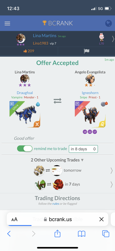 LF leo igneohorn lacerate+ please Continue with Facebook clear OR attach pictures Battle Camp Monster Trading Marketplace Trade Details ★★★ Ollie Tremlett 2w ago Tremo123 L70 Add if you need help 147 3y ago Offer Accepted Ollie Tremlett ★ ★ ★ Polarogre Deadshot+ Rogue+ · 1 MEQ111 Rahman Rahman ★ ★ ★ Igneohorn Lacerate+ Lethal+ · 1 EQ LF leo igneohorn lacerate+ please 10 comments ★★ · Brayan Abrahan Sejas 2x1 Patchhound Snipe Cleric · 2 M declined · 3y ago · translate ★★ · Brayan Abrahan Sejas +400% attack Vegeterrier Snipe Bulwark · 1 declined · 3y ago ★★★ Максим Чекалин 1 / 2 polarogre maks Marsupadore Snipe Gladiator · 1 M declined · 3y ago · translate ★★ · Belkacem D. Polarogre Deadshot+ Rogue+ · 3 EQ declined · 3y ago ★★★ Alejandro Perez Igneohorn Snipe Lethal · 1 M declined · 3y ago ★★★ Lina Martins Incoming trade declined · 3y ago · translate ★★★ Ollie Tremlett Sorry looking for lacerate 3y ago · translate ★★★ Rahman Rahman Igneohorn Lacerate+ Lethal+ · 1 EQ offer accepted · 3y ago ★★★ Ollie Tremlett Rahman Rahman can you max? 3y ago · translate ★★★ Rahman Rahman ok..max for max 3y ago · translate You must login to offer a trade. Related #battlecamp, #mobile, #mmo, #pvp PvP - Grapes1982 vs Echua8 Another awesome pair of leaf teams titans throw down, Grapes1982 and Echua8. Check out their intense side by side match. #battlecamp, #pvp, #team, #mobile, #mmo PvP - DShep420 vs Chanco21 - 2nd match Part Two of Dshep420 and Chanco21’s Rainbow Specials PvP. Observe how the balance of healing and hitting can make or break a heated battle. #battlecamp, #mobile, #mmo, #pvp Carlos Grapes vs mic1989 Watch PvP Warlord Carlos Grapes against a team of legendaries... what do you think will happen? ;) Check out Carlos's PvP Profile on Battle Camp Bible #battlecamp, #pvp, #team, #mobile, #mmo PvP - Dshep420 vs Chanco21 Two seasoned Rainbow PvPers slug it out in one of the preliminary rounds of the Rainbow Specials Tournament. Watch how each player make massive combos to knock each other out. #battlecamp, #pvp, #team, #mobile, #mmo PvP - Grapes vs. dev mythic team When all epic and legendary teams die in 10 sec, an ultra team showed some fight... #battlecamp, #pvp, #team, #mobile, #mmo PvP - Broyalty vs. MiaJane Watch Broyalty's wind team vs. MiaJane's rock team. Broyalty has a 1530 PvP rating with a 4:1 win to loss ratio! scroll to top