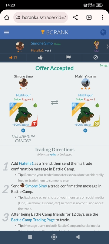 THE SAME IN CANCER Continue with Facebook clear OR attach pictures Battle Camp Monster Trading Marketplace Trade Details ★★ · Simone Simo 5h ago Fiatella1 vip 4 L70 CHI GIOCA A MOSAIC? 37 9mo ago Offer Accepted Simone Simo ★ ★ · Clayture Snipe Bruiser · 1 +500% attack M Mahir Yıldırım ★ ★ ★ THE SAME IN CANCER 3 comments ★★★ Mahir Yıldırım Hello brother, we made a deal with you. I can't find this monster in my inventory, I think I used it as a feeder, I didn't notice it. 9mo ago · translate ★★★ Mahir Yıldırım Instead, I want to offer you this monster. If you accept, I will give you this monster as a gift to make up for my mistake. 9mo ago · translate ★★★ Mahir Yıldırım offer accepted · 9mo ago You must login to offer a trade. Related #battlecamp, #mobile, #mmo, #pvp PvP - Grapes1982 vs Echua8 Another awesome pair of leaf teams titans throw down, Grapes1982 and Echua8. Check out their intense side by side match. #battlecamp, #pvp, #team, #mobile, #mmo PvP - DShep420 vs Chanco21 - 2nd match Part Two of Dshep420 and Chanco21’s Rainbow Specials PvP. Observe how the balance of healing and hitting can make or break a heated battle. #battlecamp, #mobile, #mmo, #pvp Carlos Grapes vs mic1989 Watch PvP Warlord Carlos Grapes against a team of legendaries... what do you think will happen? ;) Check out Carlos's PvP Profile on Battle Camp Bible #battlecamp, #pvp, #team, #mobile, #mmo PvP - Dshep420 vs Chanco21 Two seasoned Rainbow PvPers slug it out in one of the preliminary rounds of the Rainbow Specials Tournament. Watch how each player make massive combos to knock each other out. #battlecamp, #pvp, #team, #mobile, #mmo PvP - Grapes vs. dev mythic team When all epic and legendary teams die in 10 sec, an ultra team showed some fight... #battlecamp, #pvp, #team, #mobile, #mmo PvP - Broyalty vs. MiaJane Watch Broyalty's wind team vs. MiaJane's rock team. Broyalty has a 1530 PvP rating with a 4:1 win to loss ratio! scroll to top