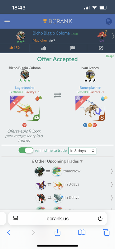 Good offer or salamano libra bane Continue with Facebook clear OR attach pictures Battle Camp Monster Trading Marketplace Trade Details ★★★ Thắng Nguyễn 9h ago QT1996 vip 7 L70 NGUYỄN QUỐC THẮNG 450 7mo ago Offer Accepted Thắng Nguyễn ★ ★ ★ Magmasaur Lacerate Panzer · 1 MPE Ivan Ivanov ★ ★ ★ Salamano Leafbane+ Cavalry+ · 1 MPEEQ Good offer or salamano libra bane 11 comments ★★★ Diego Miguel Tentaweb Snipe+ Cavalry+ · 1 declined · 7mo ago ★★★ Ivan Ivanov Salamano Leafbane+ Cavalry+ · 1 MPEEQ offer accepted · 7mo ago ★★★ Thắng Nguyễn Verry good bro if 2 liza i will accept 2:2 7mo ago · translate ★★★ Ivan Ivanov Liza This libra? 7mo ago · translate ★★★ Ivan Ivanov 1 libra 1virgo 2-2? 7mo ago · translate ★★★ Thắng Nguyễn 2 liza 7mo ago · translate ★★★ Ivan Ivanov Accept 7mo ago · translate ★★★ Thắng Nguyễn Towmrow trade 7mo ago · translate ★★★ Ivan Ivanov 7mo ago ★★★ Ivan Ivanov 8-9 days trading 7mo ago · translate ★★★ Thắng Nguyễn Ok ok np 7mo ago · translate You must login to offer a trade. Related #battlecamp, #mobile, #mmo, #pvp PvP - Grapes1982 vs Echua8 Another awesome pair of leaf teams titans throw down, Grapes1982 and Echua8. Check out their intense side by side match. #battlecamp, #pvp, #team, #mobile, #mmo PvP - DShep420 vs Chanco21 - 2nd match Part Two of Dshep420 and Chanco21’s Rainbow Specials PvP. Observe how the balance of healing and hitting can make or break a heated battle. #battlecamp, #mobile, #mmo, #pvp Carlos Grapes vs mic1989 Watch PvP Warlord Carlos Grapes against a team of legendaries... what do you think will happen? ;) Check out Carlos's PvP Profile on Battle Camp Bible #battlecamp, #pvp, #team, #mobile, #mmo PvP - Dshep420 vs Chanco21 Two seasoned Rainbow PvPers slug it out in one of the preliminary rounds of the Rainbow Specials Tournament. Watch how each player make massive combos to knock each other out. #battlecamp, #pvp, #team, #mobile, #mmo PvP - Grapes vs. dev mythic team When all epic and legendary teams die in 10 sec, an ultra team showed some fight... #battlecamp, #pvp, #team, #mobile, #mmo PvP - Broyalty vs. MiaJane Watch Broyalty's wind team vs. MiaJane's rock team. Broyalty has a 1530 PvP rating with a 4:1 win to loss ratio! scroll to top
