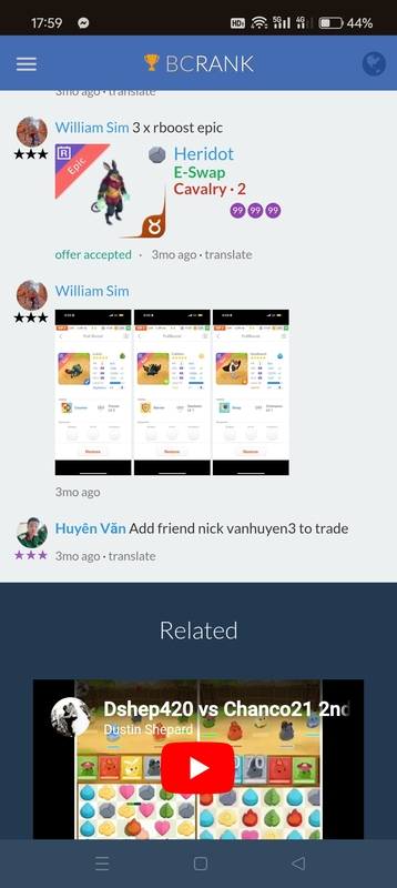 LF vensickle or psychosiren Continue with Facebook clear OR attach pictures Battle Camp Monster Trading Marketplace Trade Details ★★★ William Sim 3mo ago Williamsim83 L70 Will~i~am PÏscés 614 7mo ago Offer Accepted William Sim ★ ★ ★ Sheenix Crush Cavalry · 3 MPE Huyên Văn ★ ★ ★ LF vensickle or psychosiren 2 comments ★★★ Huyên Văn offer accepted · 7mo ago ★★★ Huyên Văn We can trade for anhhuyen3 7mo ago · translate You must login to offer a trade. Related #battlecamp, #mobile, #mmo, #pvp PvP - Grapes1982 vs Echua8 Another awesome pair of leaf teams titans throw down, Grapes1982 and Echua8. Check out their intense side by side match. #battlecamp, #pvp, #team, #mobile, #mmo PvP - DShep420 vs Chanco21 - 2nd match Part Two of Dshep420 and Chanco21’s Rainbow Specials PvP. Observe how the balance of healing and hitting can make or break a heated battle. #battlecamp, #mobile, #mmo, #pvp Carlos Grapes vs mic1989 Watch PvP Warlord Carlos Grapes against a team of legendaries... what do you think will happen? ;) Check out Carlos's PvP Profile on Battle Camp Bible #battlecamp, #pvp, #team, #mobile, #mmo PvP - Dshep420 vs Chanco21 Two seasoned Rainbow PvPers slug it out in one of the preliminary rounds of the Rainbow Specials Tournament. Watch how each player make massive combos to knock each other out. #battlecamp, #pvp, #team, #mobile, #mmo PvP - Grapes vs. dev mythic team When all epic and legendary teams die in 10 sec, an ultra team showed some fight... #battlecamp, #pvp, #team, #mobile, #mmo PvP - Broyalty vs. MiaJane Watch Broyalty's wind team vs. MiaJane's rock team. Broyalty has a 1530 PvP rating with a 4:1 win to loss ratio! scroll to top
